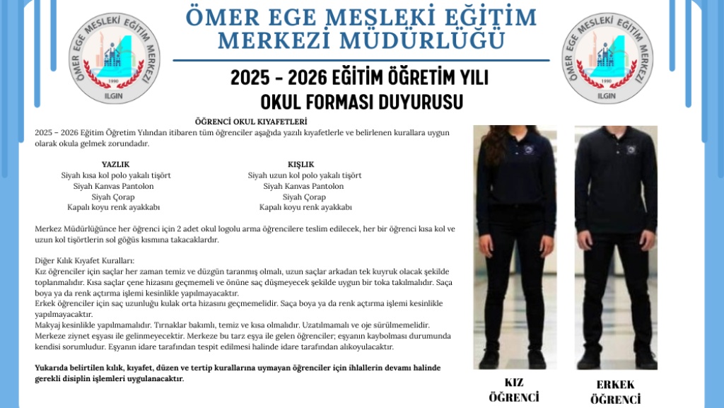 2025-2026 Eğitim Öğretim Yılında Milli Eğitim Bakanlığımızın almış olduğu karar sonrası merkezimize ait okul forma düzeni ve şekli belirlenmiş olup, velilere maddi külfet getirmeme noktasında hassasiyet gösterilerek görselde bulunan son halini almıştır. Merkezimiz için hayır olması dileklerimizle 2025-2026 eğitim öğretim yılı merkezimiz, ilçemiz ve ülkemiz adına hayırlı uğrlu olsun.